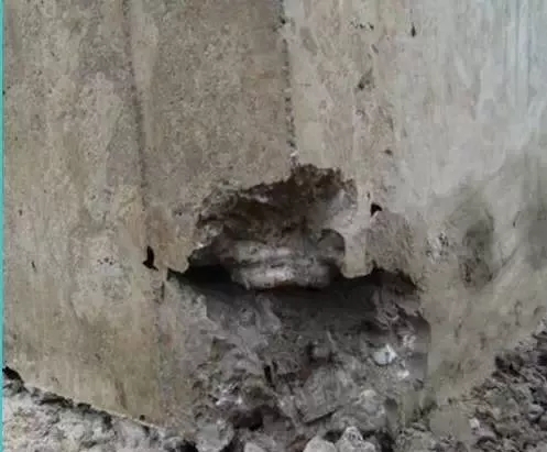 三、孔洞 (1)同“蜂窩”原因; (2)鋼筋太密,混凝土骨料太粗,不易下灰,不易振搗; (3)洞口、坑底模板無排氣口,混凝土內有氣囊。 1、防治措施 ①在鋼筋密集處采用高一強度等級的細石混凝土,認真分層搗固或配以人工插搗; ②有預留孔洞處應從其兩側同時下料,認真振搗; ③及時清除落入混凝土中的雜物。 2、處理方法 鑿除孔洞周圍松散混凝土,用高壓水沖洗干凈,立模后用高一強度等級的細石混凝土仔細澆筑搗固。